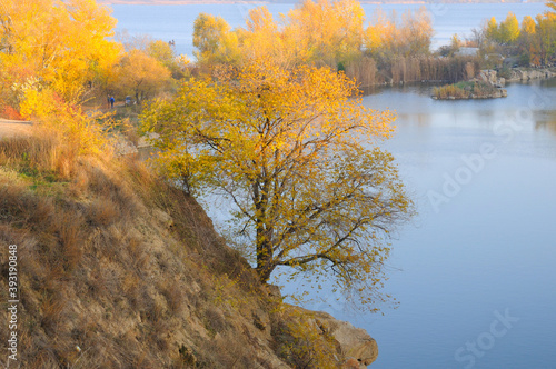 Fototapeta premium Yellow autumn maple on a steep slope by the river