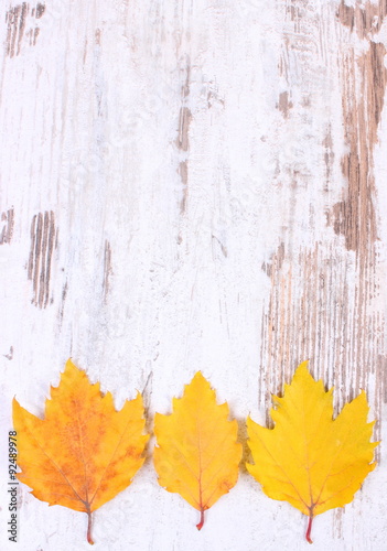 © ratmaner, Obraz premium Yellow autumnal leaves with copy space for text on wooden background