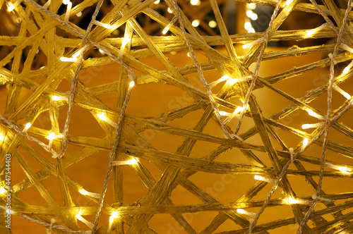 © Iuliia Alekseeva, Fototapeta premium Yellow background intertwined wooden branches with lights.