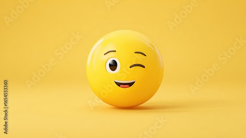 © Halina, Fototapeta premium Yellow background with 3d emoji face showing wink and smile expression in playful minimal style