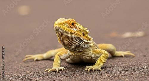 © Merry, Obraz premium Yellow Bearded Dragon on a Brown Surface.