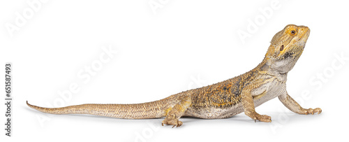 © Nynke, Fototapeta premium Yellow Bearded Dragon standing side ways. Looking side ways away from camera. Isolated on a white background.