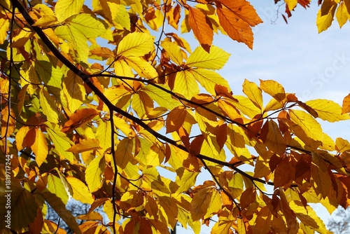 © hmara.aes, Fototapeta premium Yellow beech branch illuminated by sunlight. Yellow wallpaper.