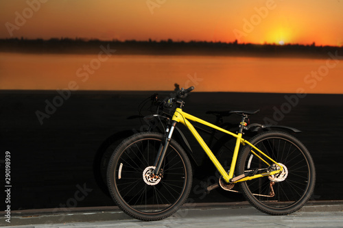© New Africa, Obraz premium Yellow bicycle parked near glass building at sunset