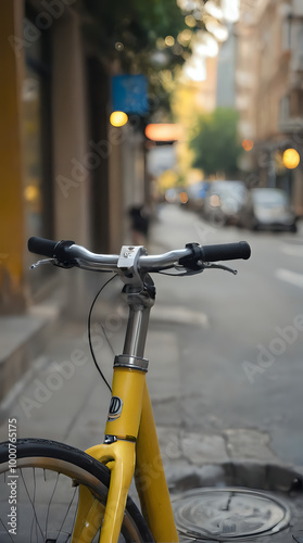 © Masum, Obraz premium yellow bicycle parked on the side of the road in front of a building