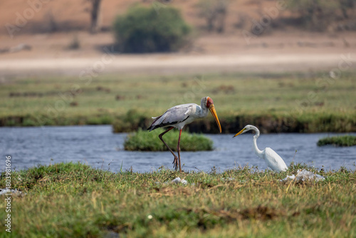 Obraz premium yellow-billed stork and great white egret in the chobe river