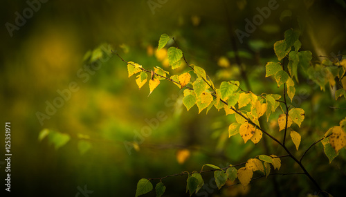 Fototapeta premium Yellow birch leaves on a blurry background