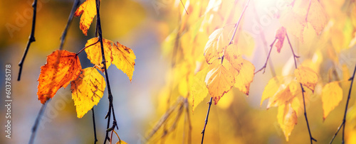 Obraz premium Yellow birch leaves on a tree close up on a blurred background. Autumn leaves