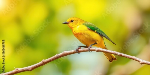 © boxcs, Obraz premium Yellow bird, green wings, perched on branch, sunny day, cute, avian