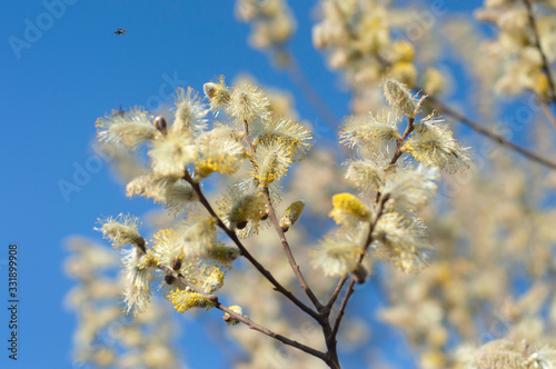 Obraz premium Yellow blooming pussy willow branch on the blue sky background.