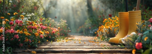 Fototapeta premium Yellow Boots Beside A Sunlit Garden Path