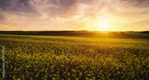 © Eugene_Photo, Obraz premium Yellow bright flowers bloom in a field of rapeseed at sunset light, creating a beautiful summer landscape. Agricultural business concept image. Vintage film asthetic.