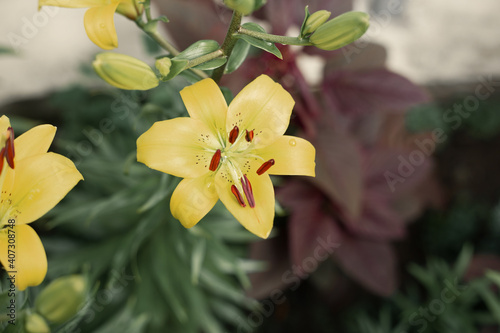 Fototapeta premium Yellow bright lily flower in the center of picture