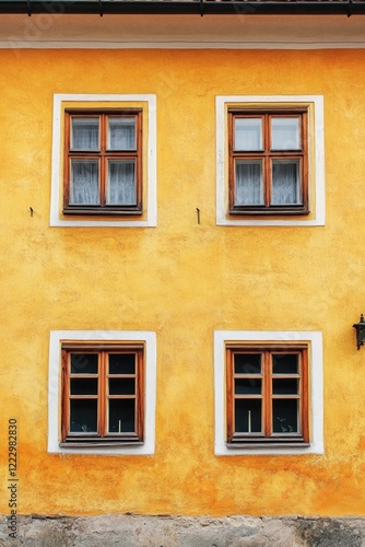 © Goncharenko, Fototapeta premium Yellow building with 3 windows and fire hydrant