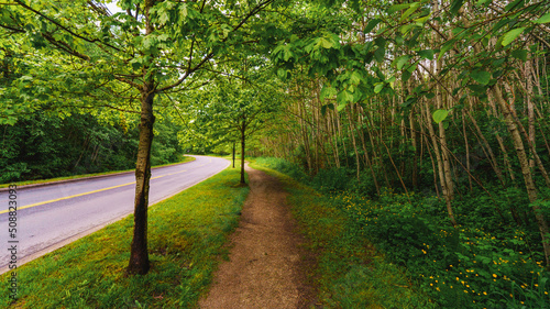 Fototapeta premium Yellow buttercups at forest edge by University Drive East on Burnaby Mountain...