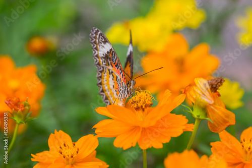 Naklejka premium Yellow Butterfly catch on yellow Cosmos flowers.