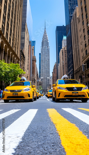 © MOCHAMAD, Naklejka premium Yellow cabs on city street, iconic skyscraper backdrop