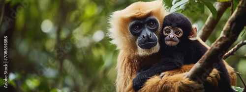 © Артур Комис, Fototapeta premium Yellow-cheeked Gibbon, Nomascus gabriellae, with grass food, orange monkey on the tree.