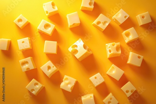 © MrHamster, Obraz premium Yellow Cheese Cubes Scattered on a Yellow Background