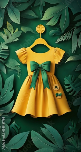 © AbdulSamad, Fototapeta premium Yellow children's dress, hanging, lush foliage