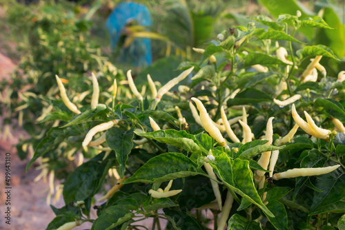 © Ladda, Naklejka premium yellow chili pepper tree at the garden in morning.