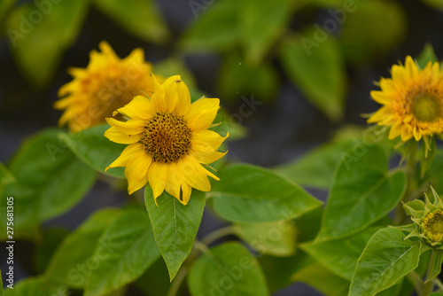 Fototapeta premium yellow chrysanthemum flowers and sunflowers on green background