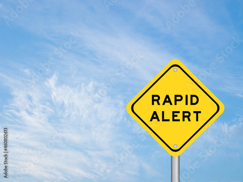 © bankrx, Naklejka premium Yellow color transportation sign with word rapid alert on blue sky background