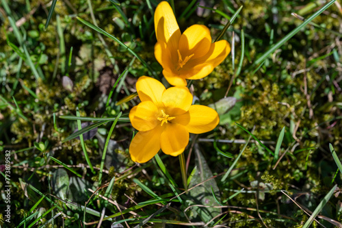 © Jonas, Fototapeta premium Yellow Crocus growing in a green mossy lawn