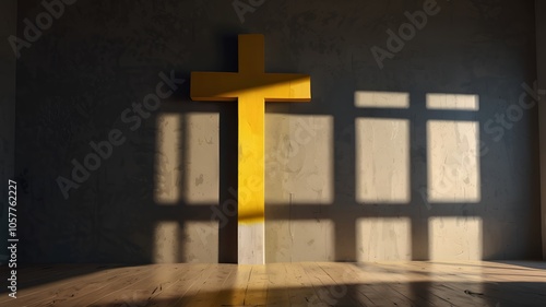 © My Faith, Naklejka premium Yellow cross in the church at gray wall, with light from window cinematic