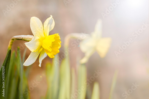 Fototapeta premium Yellow daffodil in the garden First spring flowers Natural spring background