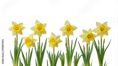 Fototapeta premium yellow daffodils are growing in a row against a white background
