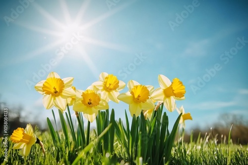 Fototapeta premium Yellow daffodils blooming in grassy field under blue sky with sun rays, capturing vibrant spring atmosphere
