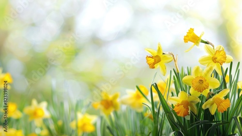 Fototapeta premium Yellow daffodils in bloom with soft-focus background sunlit field