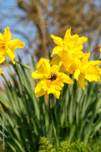 Fototapeta premium Yellow daffodils with bumblebee in the spring garden. High quality photo