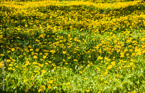 Obraz premium Yellow dandelions and green grass, springtime