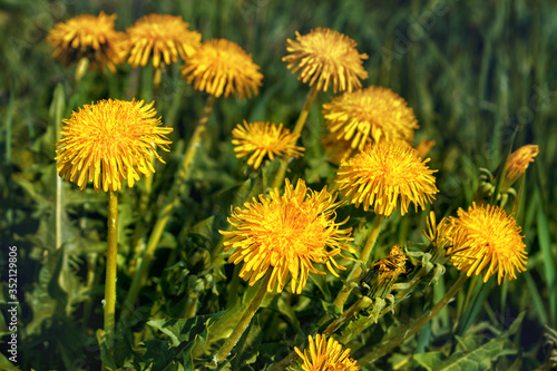Fototapeta premium Yellow dandelions on a field against a background of green grass