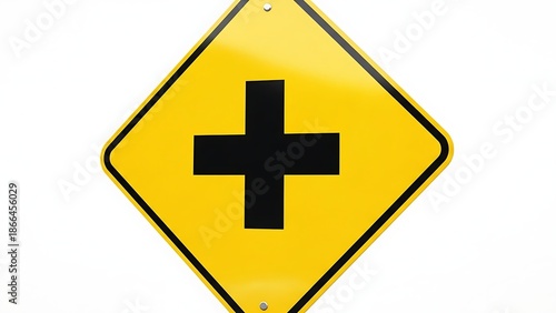 Obraz premium Yellow diamond shaped road sign with black cross symbol