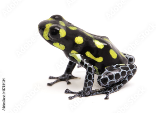 Obraz premium Yellow dotted poison dart or arrow frog, Ranitomeya vanzolinii. A small poisonous rain forest animal fwith warning colors. Isolated on white background..