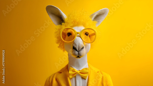 © utaem2022, Naklejka premium Yellow dressed alpaca wearing clown wig and glasses