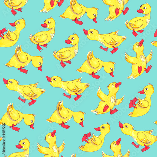 © Darina, Fototapeta premium Yellow ducks colorful seamless pattern for children on blue
