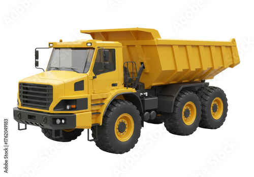© Daniel, Fototapeta premium Yellow dump truck isolated on transparent background, heavy construction vehicle for mining and earthmoving projects PNG