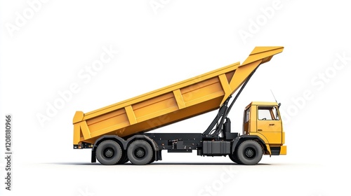 © Fenny, Fototapeta premium Yellow dump truck unloading, studio shot, white background, construction