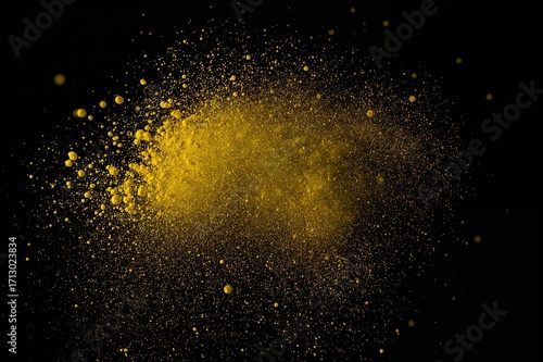Fototapeta premium Yellow dust particles floating separately against a dark backdrop, motion powder dispersion.