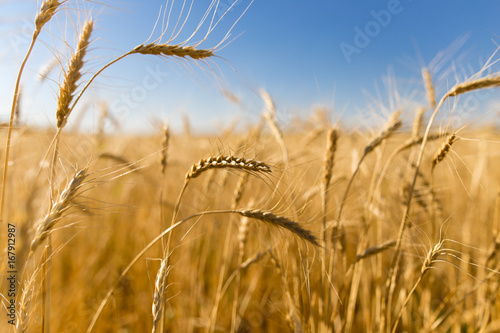 Fototapeta premium Yellow ears of wheat against the blue sky