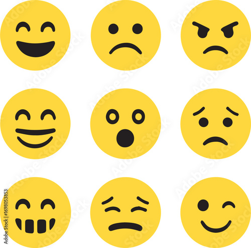 Fototapeta premium Yellow emoji and emoticon faces set vector graphic Icons on white background
