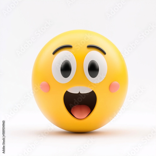 Fototapeta premium Yellow emoji with a cheerful face, open mouth, and wide eyes, depicting excitement and happiness, placed against a plain white background