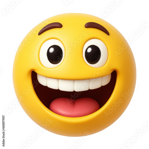 Fototapeta premium Yellow emoji with wide smile and open mouth view isolated transparent background