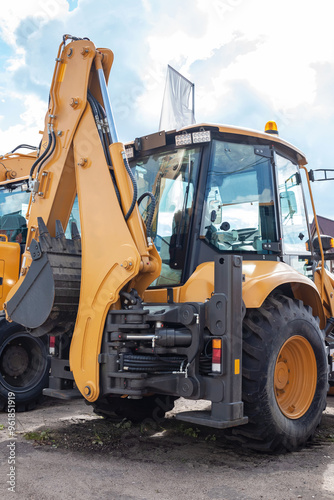 Fototapeta premium Yellow excavator at the back. Construction equipment.