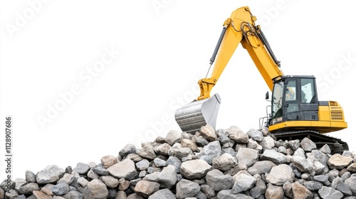 Obraz premium Yellow Excavator Digging Rocks on White Background