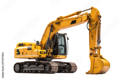 © adri, Fototapeta premium Yellow excavator on black background. Large, articulated arm, bucket, and treads. Heavy equipment